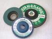 Disco em grão zircônio ou cerâmico e base em fibra de vidro ou nylon, disponível nos tamanhos 115x22mm e 180x22mm nos grãos 024, 036, 040, 050, 060, 080 e 120. Permite o desbaste e o acabamento em uma única operação, sem troca de ferramenta ou de discos. Desbaste de solda, rebarbação, nivelamento de superfícies e muitas outras operações em aço inoxidável, alumínio, metais ferrosos e não ferrosos.
